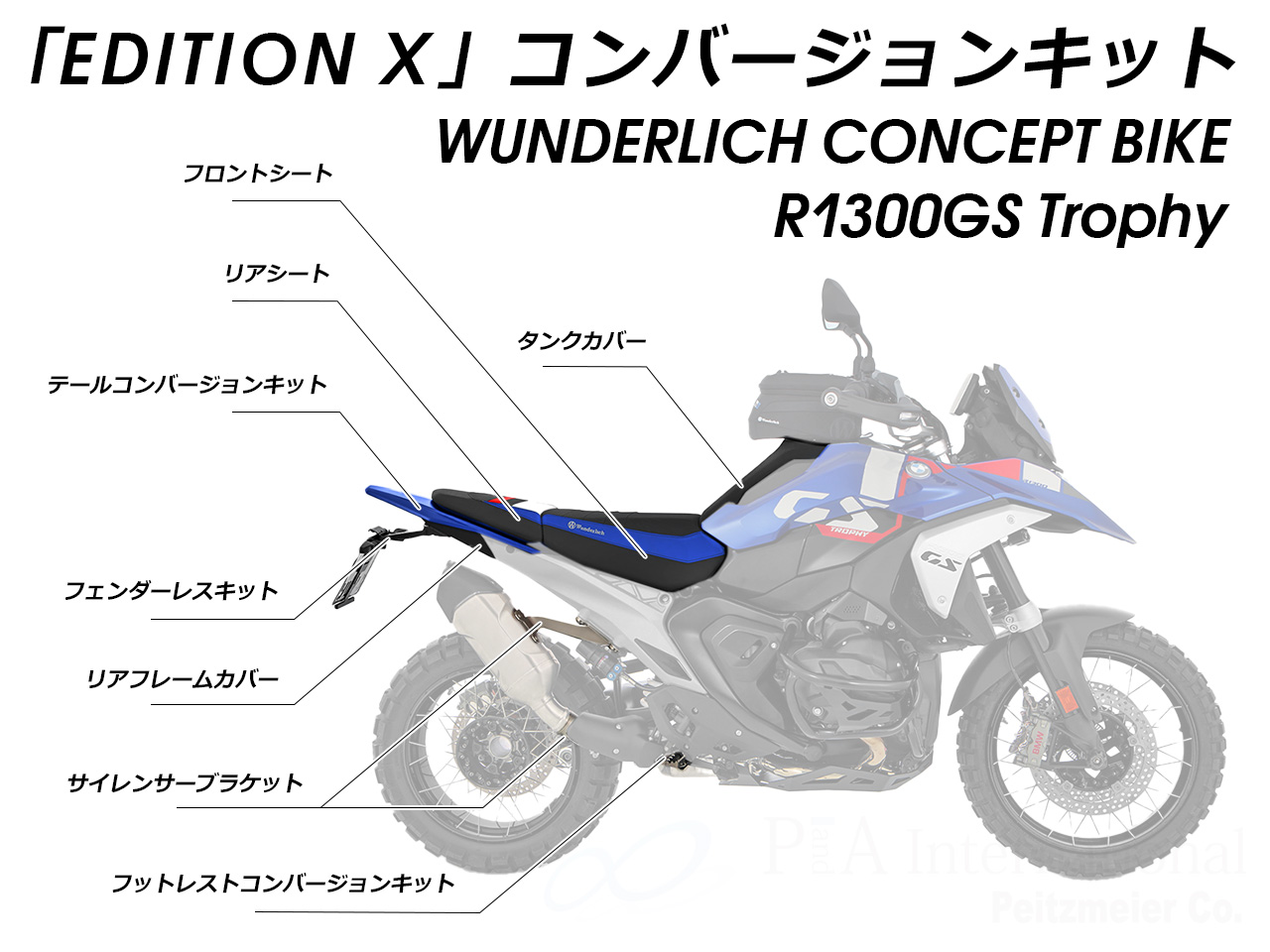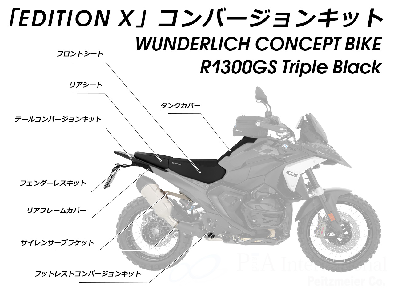 スワイプでスクロール、クリック(タップ)で拡大表示 | R1300GSのカスタムパーツ ワンダーリッヒのコンセプトバイク「R1300GS EDITION X」のコンセプトは、R1300GSをより刺激的で挑戦的な妥協なきオフロード・ハードエンデューロへと変貌させることでした。 このコンバージョンキットは「R1300GS EDITION X」のコンセプトを具現化するお得なコンプリートキットです。単なるドレスアップではなく機能重視のパッケージとなっており、R1300GSはより実用性を増した「EDITION X」仕様へと生まれ変わります。 ダイナミックなリアビュー エンデューロスタイルを実現するテールコンバージョンキット 「Edition X」は、シャープでスッキリとしたリアエンドを実現。 ダイナミックアングルサイレンサーキット 「Edition X」は純正サイレンサーの角度を+18.5度上方に持ち上げ、オフロード走行に適したクリアランスをもたらします。 そしてフェンダーレス化を可能とするライセンスプレートホルダーとの組み合わせにより、EDITION X コンセプトを象徴する俊敏な外観を生み出します。 上質なデザインと機能の完全な融合 傷が付きやすいタンクの樹脂パーツを保護するタンクカバー「カスタムフィット」は、Wunderlichのシートと組み合わせることで、デザインと質感が高級感のある見た目を生み出します。 「Edition X」シートセットはスポーツ志向のエンデューロおよびオフロード走行を前提に設計。 フロントシートとリアシートはシームレスにつながり、身体の動きを制限するような段差や輪郭を排除することで、オフロードにおける高いコントロール性と、座位・スタンディングの両ポジションにおける直感的な自由な動きを実現しています。 「究極」のコントロール フットレストコンバージョンキット「ULTIMATE」は、純正ペグよりも幅広のトレッド面を備え、加重をより均等に分散します。 高いグリップ性能で、あらゆる路面状態でも優れたコントロール性を発揮。振動を低減し、安定性を向上させ安心感のある乗り心地を実現。 ※ダイナミックアングルサイレンサーキット 「Edition X」は純正標準サイレンサーのみに適合。また、スポーツ走行専用に開発されているため、オフロードでのみ使用可能です。 ※エディションX コンバージョンキットは下記のパーツから構成されています。