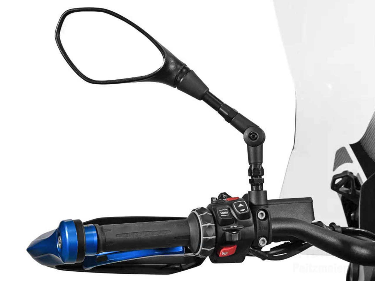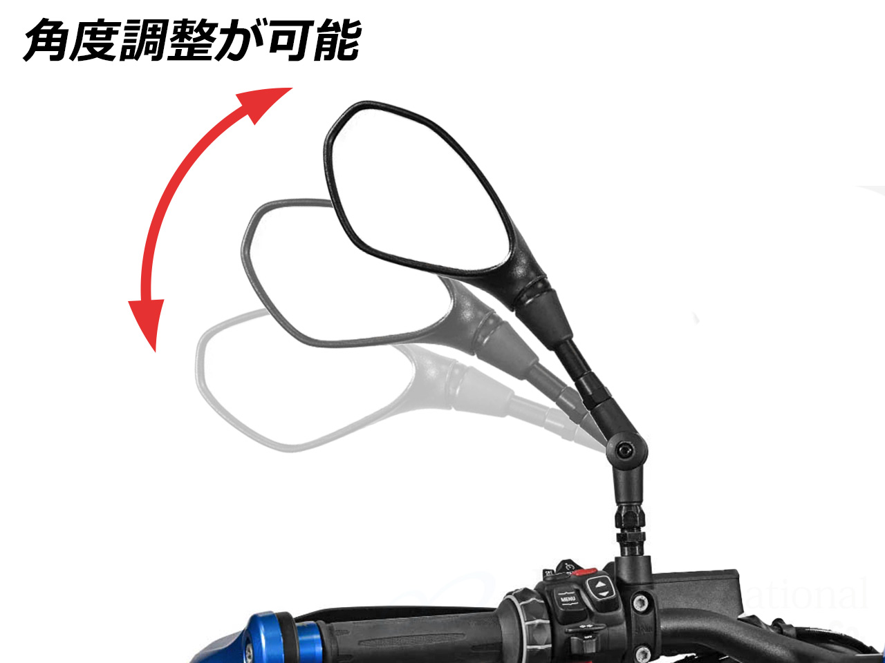 スワイプでスクロール、クリック(タップ)で拡大表示 | 角度が無段階に調整でき、折りたたみ式のため、調整により好みの視界を確保できます。 また転倒時にミラーの破損を防ぎます。 「フラッシュ」モデルはアーム長の調節も可能。 凸面鏡ガラスによる拡大効果で、より広範囲の視界を確保。 車検対応品。接触時にミラーが回転する機構を備えています。 左右共通、1本単位での販売です。 |