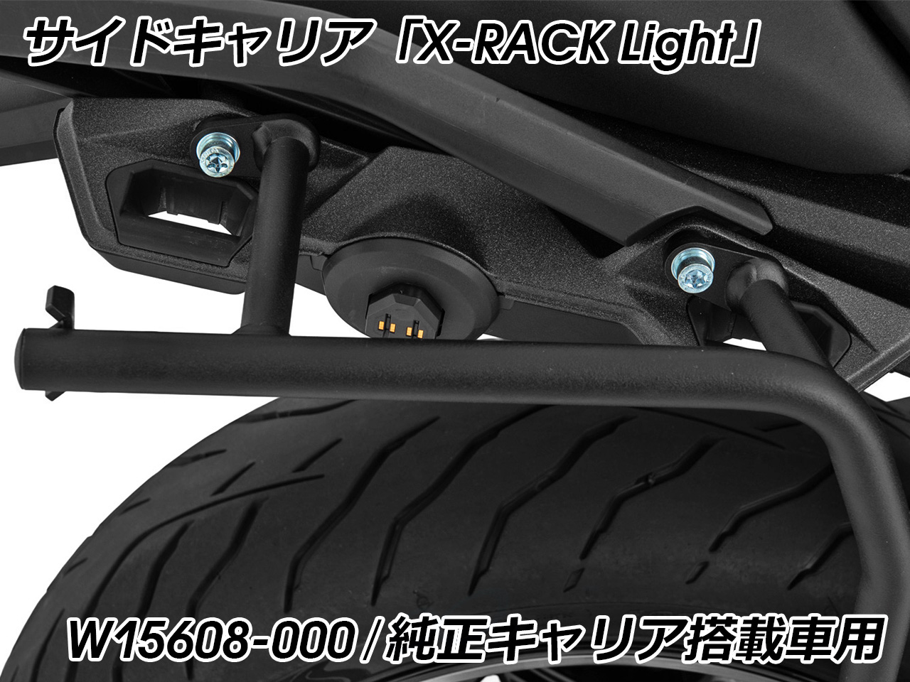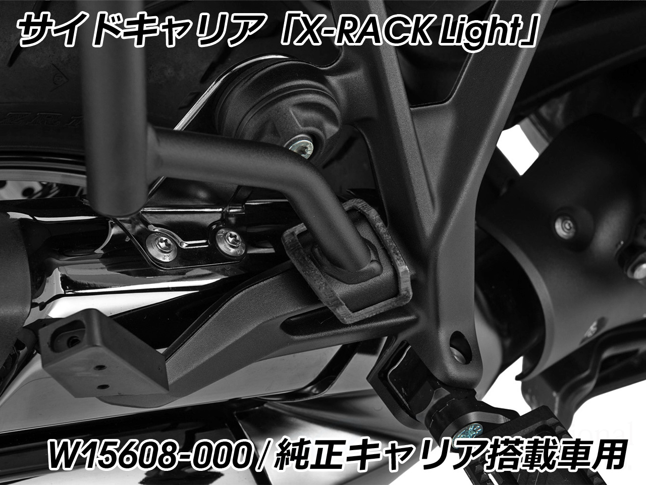 さらに1箇所のキー操作で、キャリアへの設置とバックの開閉ロックが可能。 ダブルロックシステムにより 簡単操作、鍵穴の少ないすっきりとした外観を実現しました。 ※標準で専用キーが付属しています。 ※オプションのカスタムシリンダーに交換すれば、車両キーとの共通化が可能。 余分なキーを持ち歩く必要がなく、鍵を使い分ける煩雑さがありません。 容量 : 左右それぞれ20リットル(拡張時30リットル)、最大合計60リットル 寸法 : 幅500mm × 高さ390mm × 奥行き270mm(拡張時340mm) エンジニアリング樹脂製 ケースの取付に必要なホルダー Wunderlich サイドキャリア「X-RACK Light」がセット。 非常に堅牢な構造と、精密な設計によって高い安定性を実現。 搭載した際の重量バランスの最適化にも重点が置かれ、走行時の安全性にも留意されています。 さらに、L字型のキャリアはケースを外した状態で目立ちにくく、車体のイメージを壊しません。 高耐久パウダー塗装仕上げ。 |