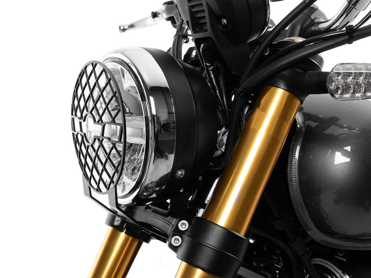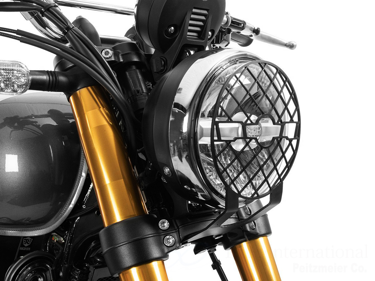 スワイプでスクロール、クリック(タップ)で拡大表示 | SpeedTwin/スピードツイン / Thruxton/R カスタムパーツ 純正ヘッドライトに装着可能なヘッドライトグリル。非常に強固な強度を持ち、ヘッドライトを守ります。グリルタイプなので、夜間走行時に危険なバックグレアも発生しません。 |