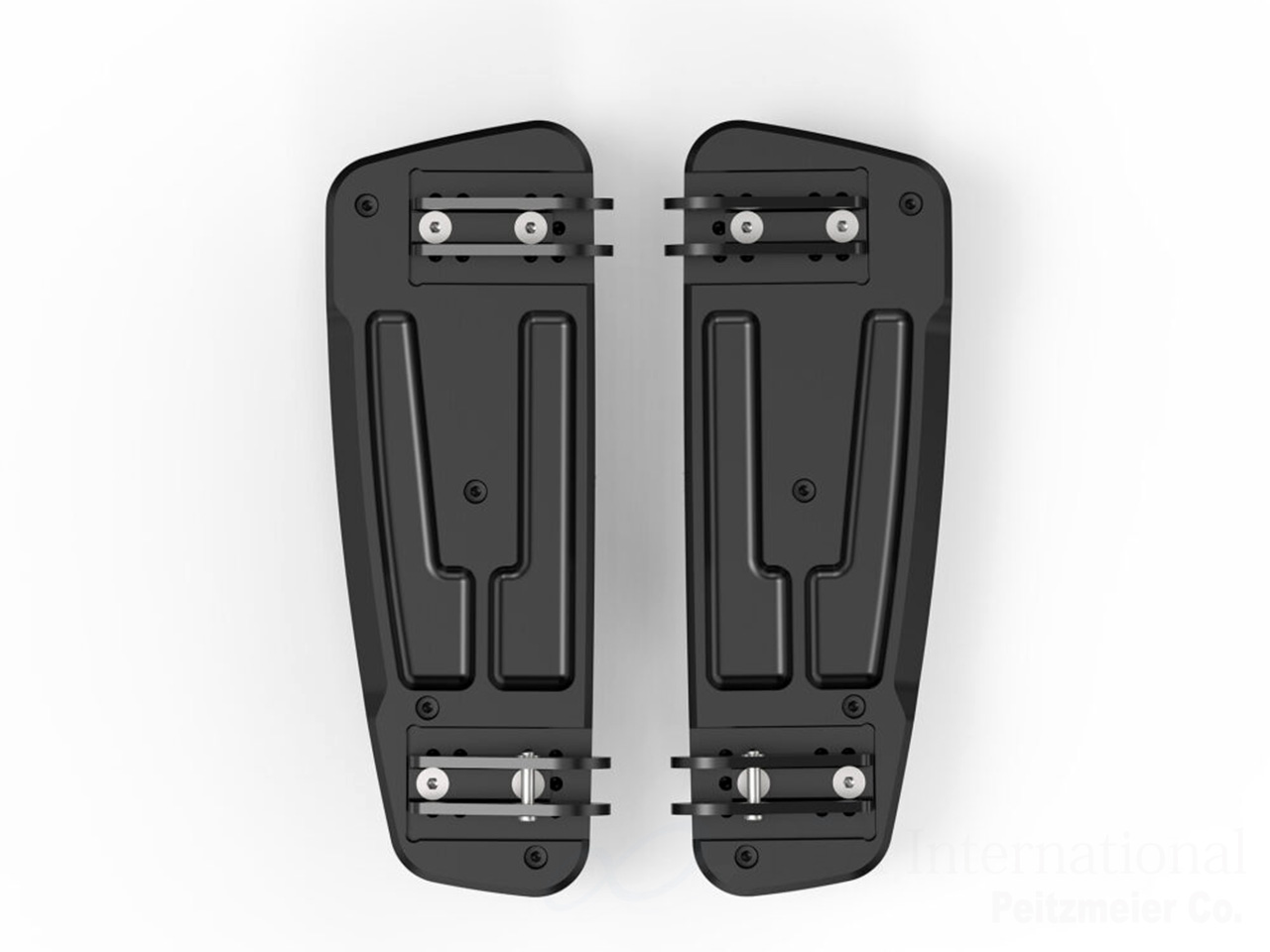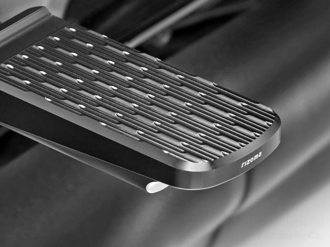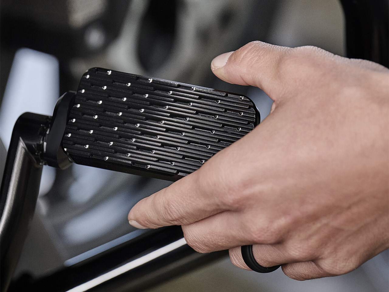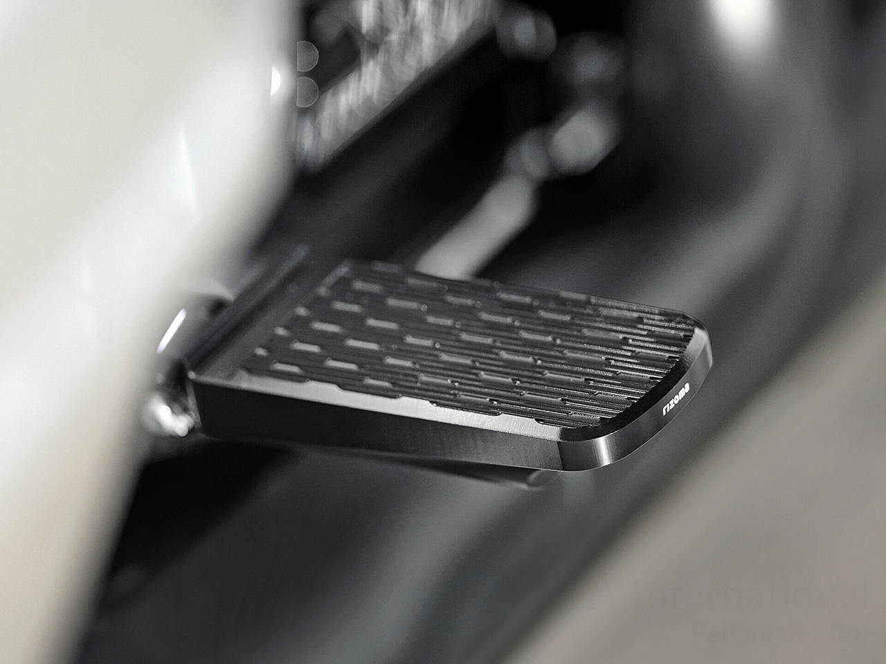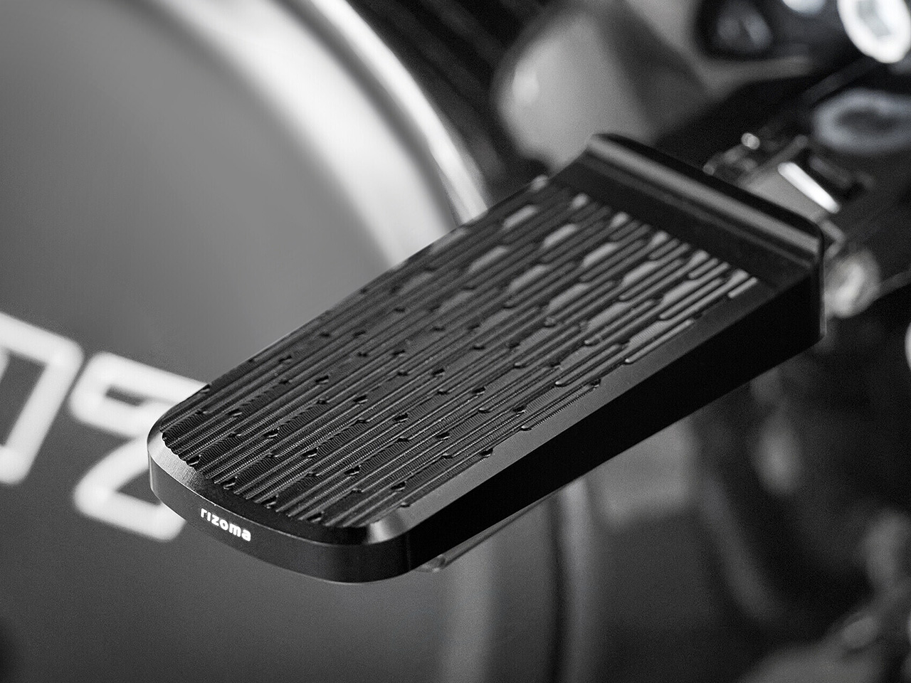精密CNC加工でビレットアルミから削り出されたフットボード。 純正よりも短くスリムな設計。バンク角を確保し、高いグリップ性能とあいまって、よりスポーティーで軽快な操作性を可能としています。 さらにアジャスト機能も持ち、前後に±10mm、外側に+10mmの位置調整が可能。 機能とスタイルを両立し、快適なライディングを実現します。 左右セット |
